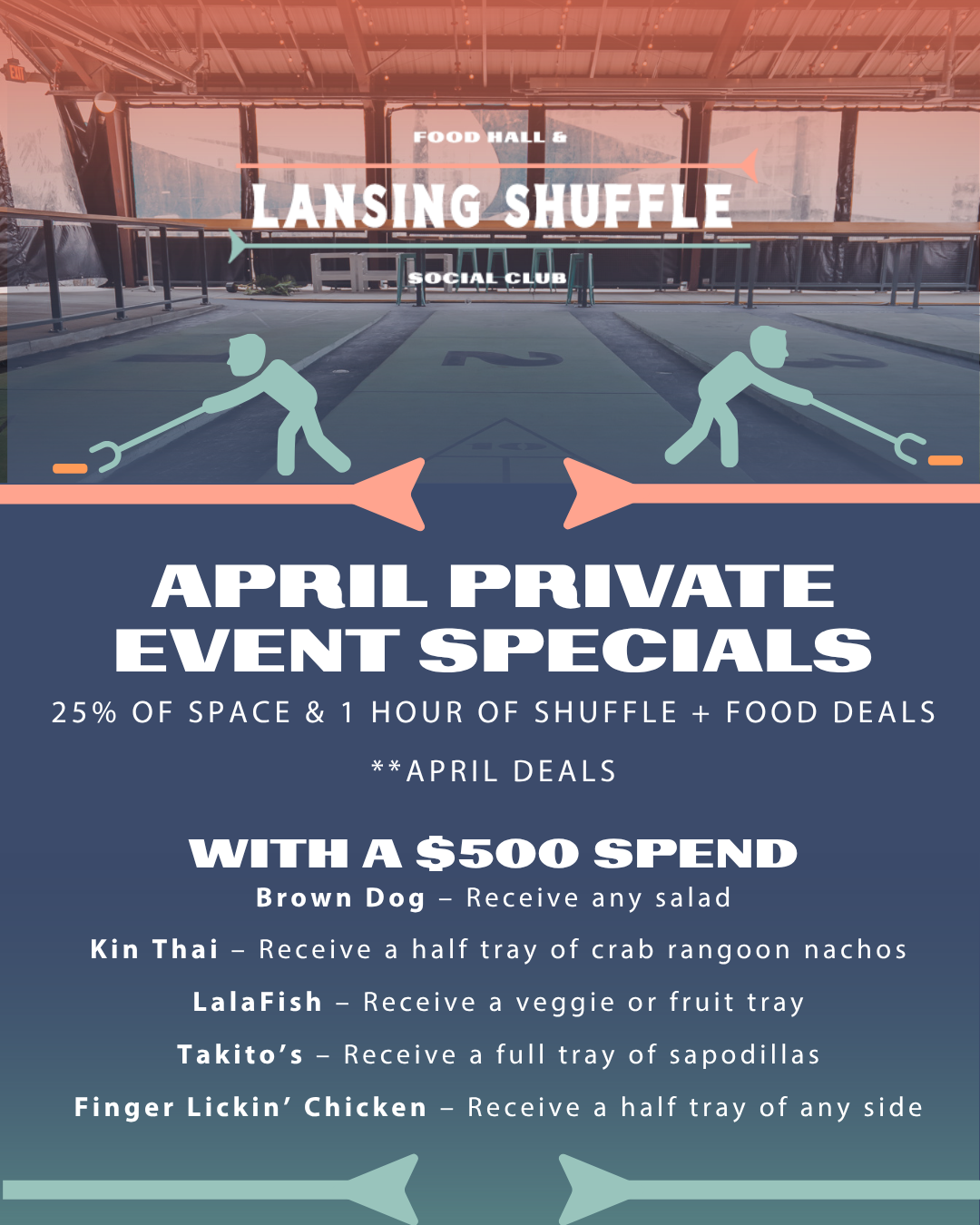 Book with Lansing Shuffle and secure your riverfront spot at one of the best venues in Lansing. Enjoy 25% off private event space plus one complimentary hour of shuffleboard, and take advantage of exclusive vendor perks—receive special offerings when you spend $500 per vendor on catering with participating vendors.