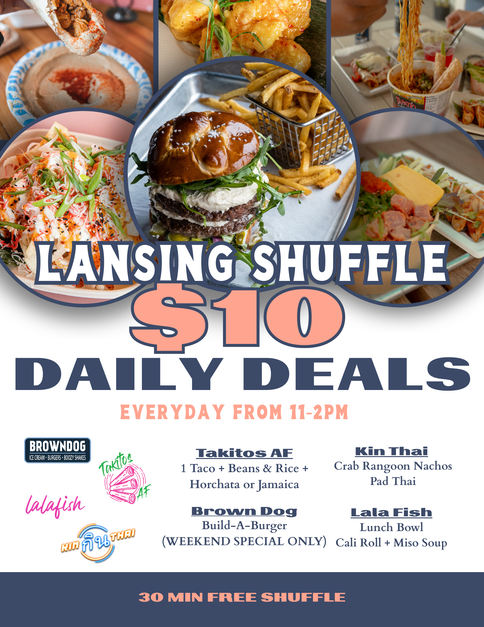 Kin Thai. Lala Fish Sushi. Browndog Burgers and Shakes. Takitos AF.