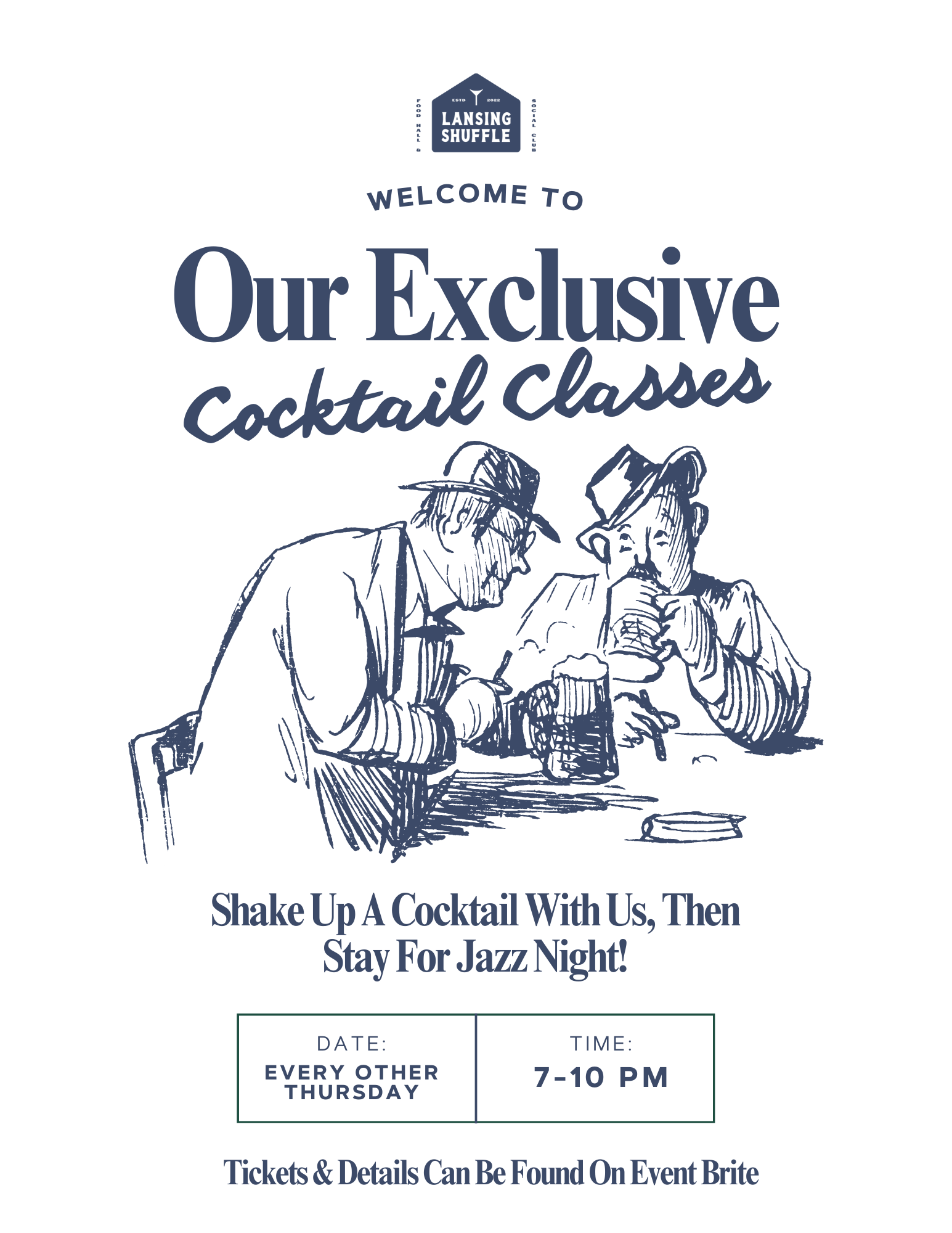 Join us at Lansing Shuffle for an unforgettable evening of smooth jazz and expertly crafted cocktails. Every other Thursday, our house jazz band sets the mood with soulful live performances while our bartenders lead interactive cocktail-making classes.