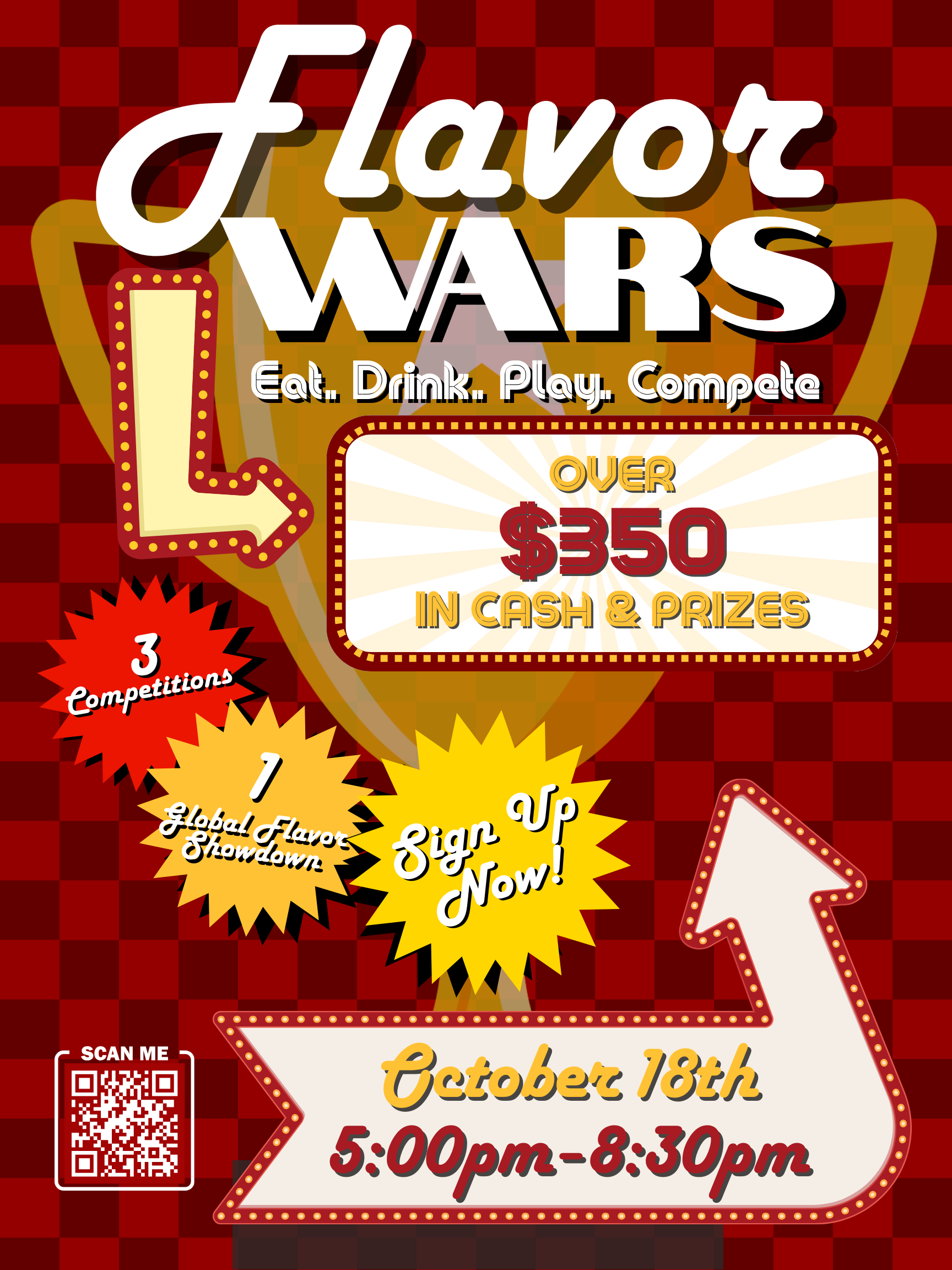 Join us for the first-ever Flavor Wars at Lansing Shuffle! Eat, drink, and compete in three exciting challenges — for your chance to win over $350 in prizes. It all happens Saturday, October 18th from 5–8:30 p.m. Don’t miss the ultimate battle of taste and talent — sign up now!