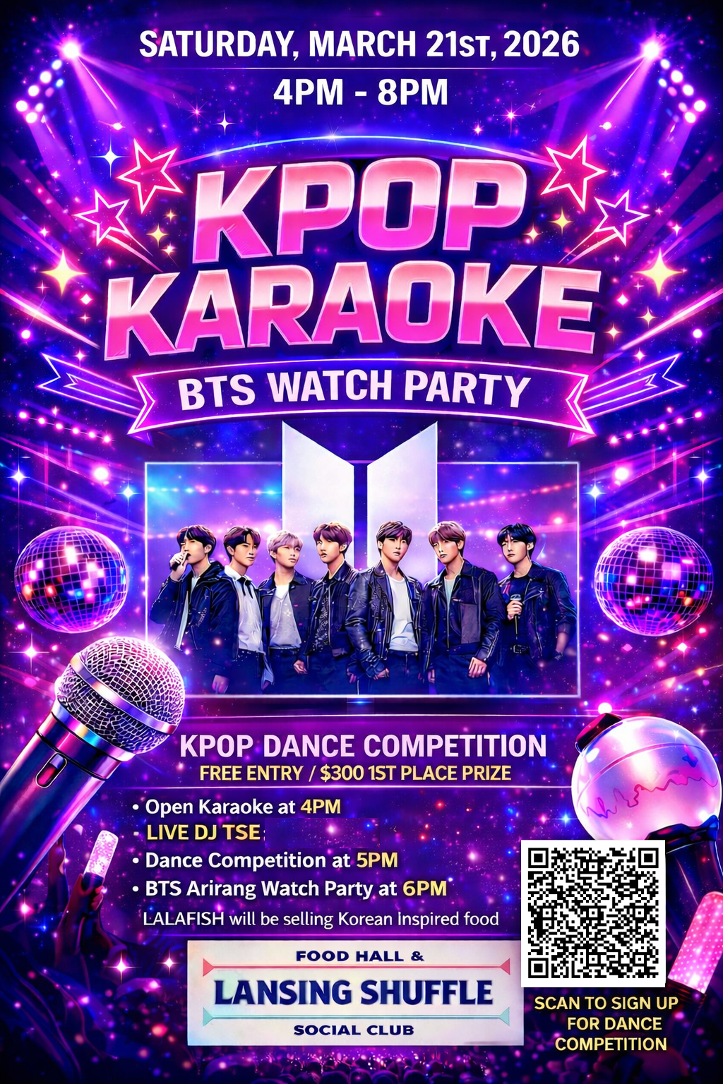 Join us Saturday, March 21 from 4PM–8PM at Lansing Shuffle for a K-Pop Karaoke Night and BTS Watch Party!