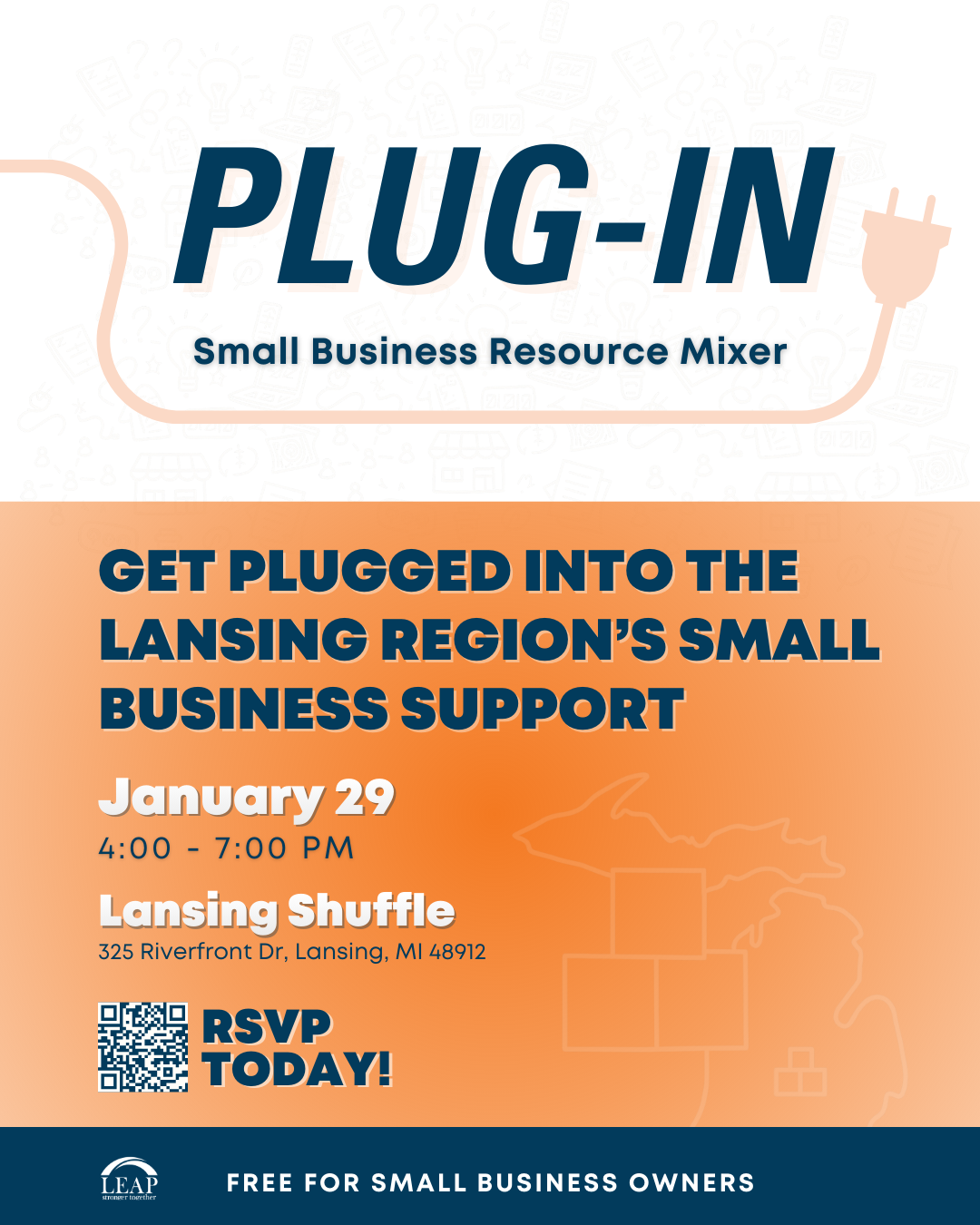 PLUG-IN - Small Business Resource Mixer . Thursday, January 29, 2026 4:00 PM 7:00 PM 16:00 19:00 Google Calendar ICS Thursday, January 29, 2026 4:00 PM – 7:00 PM Lansing ShuffleRVSP!!! RSVP Here